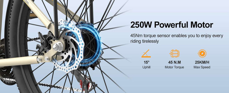 Hidden inside the rear wheel is a 250W brushless geared hub motor. It’s so quiet you’ll barely notice it’s there, but you’ll definitely feel the boost.